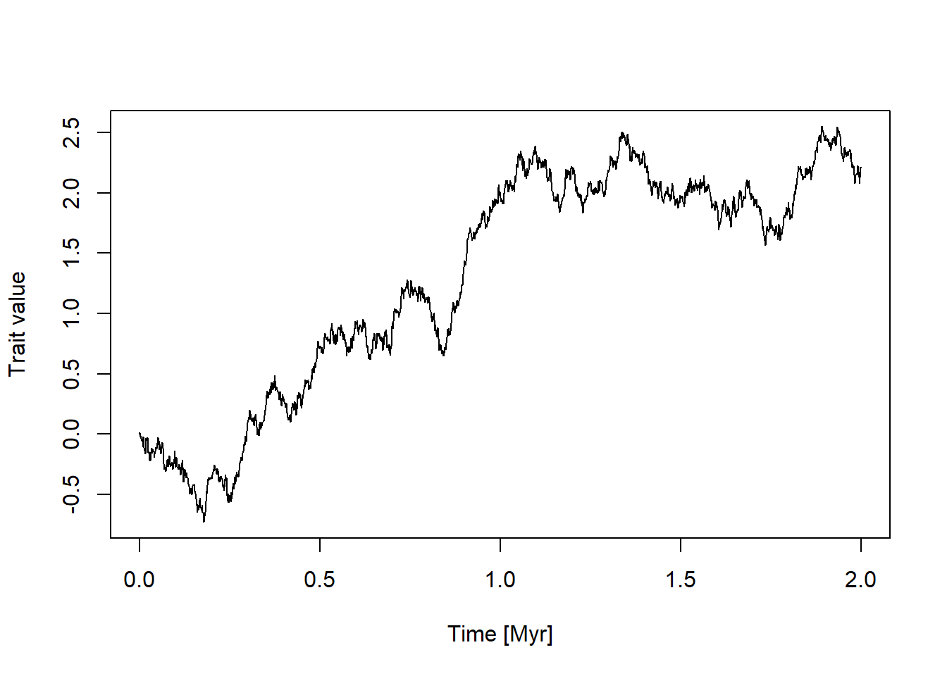Important endmembers are: sigma set to 0, trait evolution is purely deterministic and specified by mu and y0. If mu and y0 are set to 0, trait evolution follows an unbiased random walk model. If sigma is set to 1, the model corresponds to a Brownian motion. For low values of sigma and mu, the random walk can be mistaken for stasis.