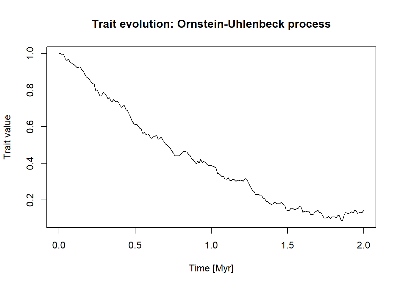 # Ornstein-Uhlenbeckmin_t =0# beginning observation [Myr]max_t =2# end observation [Myr]t_step =0.01# temporal resolution [Myr]theta =1# model parameter, to modifysigma =0.1# model parameter, to modifymu =0# model parameter, to modifyy0 =1# model parameter, to modifyseq(from = min_t, to = max_t, by = t_step) |>ornstein_uhlenbeck(mu = mu, theta = theta, sigma = sigma, y0 = y0) |>plot(type ="l",xlab ="Time [Myr]",ylab ="Trait value",main ="Trait evolution: Ornstein-Uhlenbeck process")