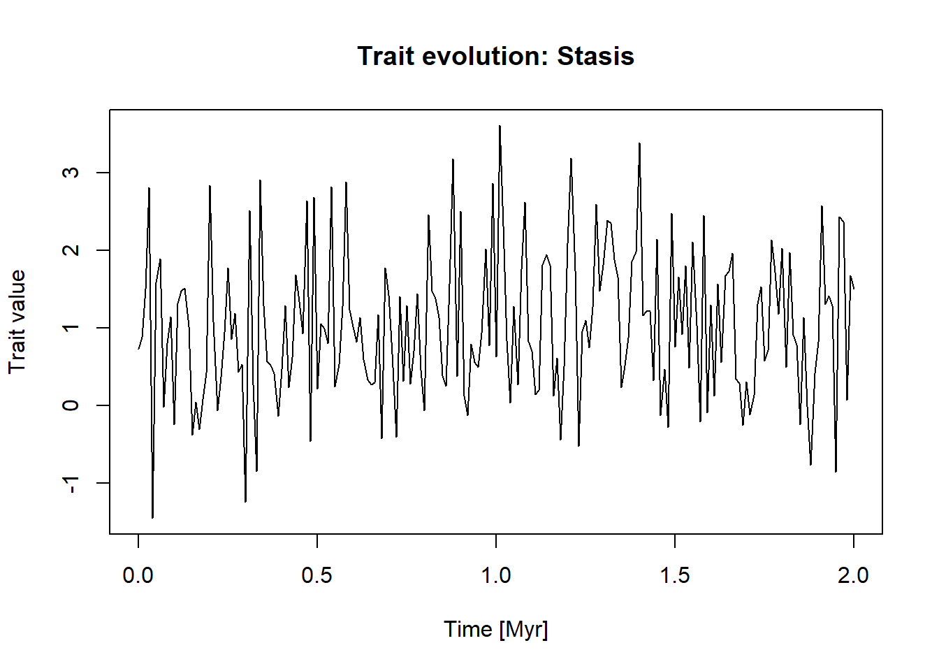 # Stasismin_t =0# beginning observation [Myr]max_t =2# end observation [Myr]t_step =0.01# temporal resolution [Myr]mean =1# model parameter, to modifysd =1# model parameter, to modifyseq(from = min_t, to = max_t, by = t_step) |>stasis(mean = mean, sd = sd) |>plot(type ="l",xlab ="Time [Myr]",ylab ="Trait value",main ="Trait evolution: Stasis")