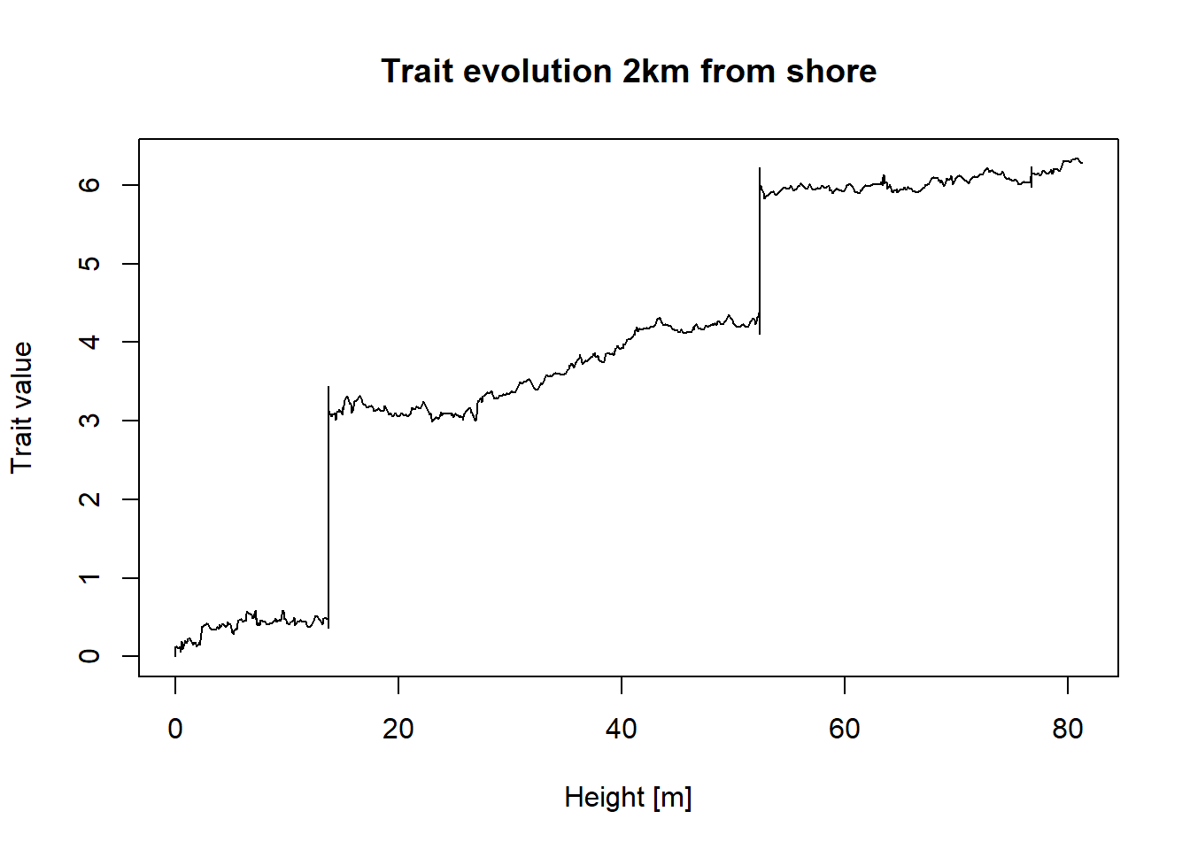 adm_list =list() # storage for age-depth modelsdist =paste(seq(2, 12, by =2), "km", sep ="") # distances from shorefor (pos in dist){ # construct ADMs for all distances adm_list[[pos]] =tp_to_adm(t = scenarioA$t_myr, h = scenarioA$h_m[,pos],T_unit ="Myr",L_unit ="m")}pos ="2km"# position on platformmu =2# model parameterssigma =1# model parametersy0 =0# model paramtersadm = adm_list[[pos]] # select age-depth modelt_step =0.001# temporal resolution [Myr]## plot trait evolution in the stratigraphic domainseq(from =min_time(adm), to =max_time(adm), by = t_step) |>random_walk(sigma = sigma, mu = mu, y0 = y0) |>time_to_strat(adm, destructive =FALSE) |>plot(ylab ="Trait value",type ="l",orientation ="lr",xlab ="Height [m]",main =paste0("Trait evolution ", pos, " from shore") )